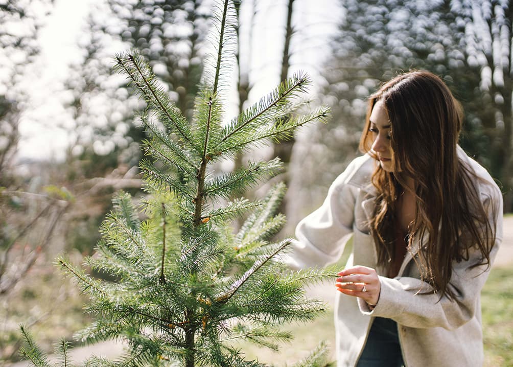 A Woodland Spray held up against a tree with ornamentsWoodland - $19